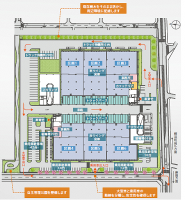 駐車台数: トラックバース128台、トラック待機スペース35台、乗用車駐車場127台、駐輪・バイク置場140台