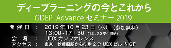 株式会社GDEPアドバンス(本社:東京都港区、代表:飯野匡道、以下 GDEPアドバンス)は、NVIDIA社と共催し、AI/HPCエンジニア、研究者向けのGDEP Advance セミナー「ディープラーニングの今とこれから」を、2019年10月23日(水)に東京・秋葉原 UDXにおいて開催します。