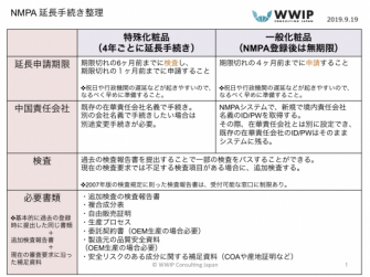 4.加えて、9月10日に発表された国家薬品監督管理局の新しい検査実施ルールにより、既に登録済みの製品に対しても追加で検査が発生するケースが生じる為、過去の登録時の検査内容と現在の検査規定を照合、精査する必要がある。(既報: https://wwip.co.jp/2019/09/13/20190912-1/)