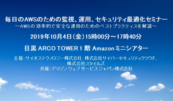 株式会社スタイルズは、サイオステクノロジー株式会社、株式会社サイバーセキュリティクラウドの3社による主催と、アマゾン ウェブ サービス ジャパン株式会社共催により、2019年10月4日(金)、目黒 ARCO TOWER 1 階 Amazon ミニシアターにて、「毎日のAWSのための監視、運用、セキュリティ最適化セミナー」を開催します。