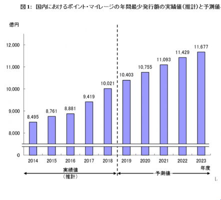 株式会社野村総合研究所は、家電量販店やクレジットカード、携帯電話など、国内11業界の主要企業*1が1年間に発行するポイント・マイレージの発行量を現金換算した「年間最少発行額*2」について、2018年度までの実績推計および2023年度までの予測を行い、2019年9月26日に公開しました。