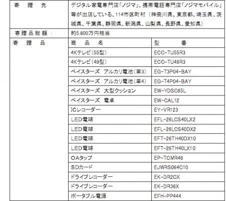 当社は、経営理念に「社会に貢献する経営」を掲げ、地域社会との共栄やCSR活動に積極的に取り組んでおります。当社では、社会貢献活動の一環として、34年前の昭和60年(1985年)より、出店している地域の自治体への寄付・寄贈を行ってまいりましたが、本年は、「4K対応テレビ」「ポータブル電源」「ドライブレコーダー」ほか、ベイスターズコラボ商品など、当社のプライベートブランド『ELSONIC』製品、全16種※1を寄贈させていただきました。