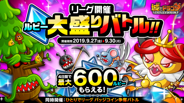 株式会社アソビズム(本社:東京都千代田区、代表取締役:大手智之)は、App Store・Google Playにて好評配信中の『城とドラゴン』で、2019年9月27日(金)より「リーグ」および「ルビー大盛りバトル」を開催中です。