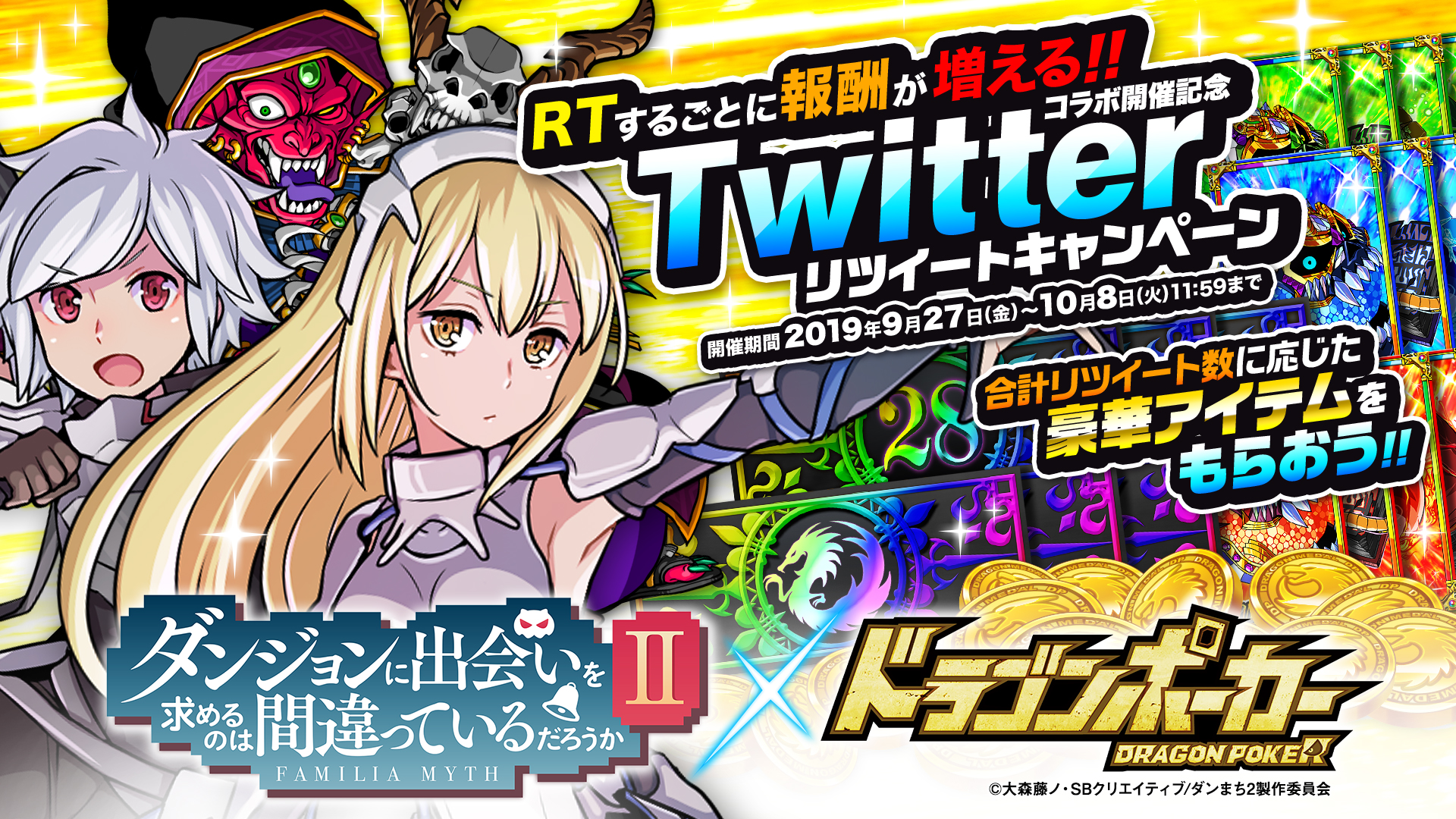 株式会社アソビズム(本社:東京都千代田区、代表取締役:大手智之)は、App Store・Google Playにて好評配信中のリアルタイム合体カードバトル『ドラゴンポーカー』で、2019年9月30日(月)よりTVアニメ『ダンジョンに出会いを求めるのは間違っているだろうかII』とのコラボイベントが開催いたします。