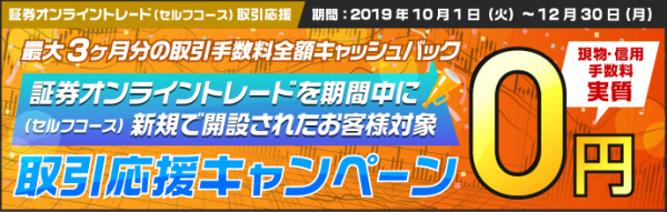 期間中に証券オンライントレード(セルフコース)を開設されたお客様を対象に、口座開設完了の翌々月末までに発生した取引手数料を全額キャッシュバックいたします。