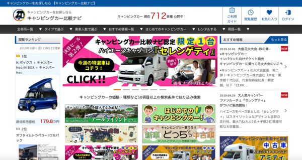 国内で販売されているキャンピングカーのスペックやオーナーなどによるクチコミ評価を比較できる情報サイト「キャンピングカー比較ナビ」を運営するキャンピングカー株式会社(本社:東京都千代田区、代表取締役:頼定 誠)は2019年10月1日、「キャンピングカー比較ナビ」内で人気のあるキャンピングカーの閲覧数ランキングを発表いたしましたので、お知らせいたします。