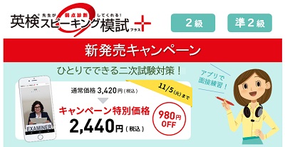キャンペーン期間中は、通常価格より980円OFFの特別価格2,440円(税込)で本アプリをご利用いただけます。本格的な英検二次試験対策が必要となるこの期間に、「英検スピーキング模試+」で、受験生の英検合格をサポートします。