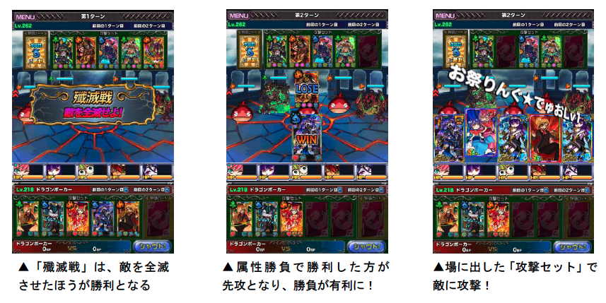 属性勝負で勝てば先攻、負ければ後攻となり、場に出した「攻撃セット」で相手に攻撃を行ないます。