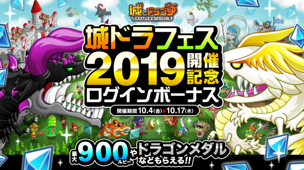 株式会社アソビズム(本社:東京都千代田区、代表取締役:大手智之)は、App Store・Google Play にて好評配信中の『城とドラゴン』で、2019年10月4日(金)より「城ドラフェス2019開催記念ログインボーナス」を開催いたします。