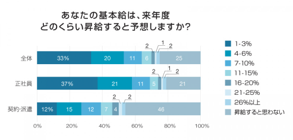 会社員2,460人に、自身の来年度の基本給の昇給について感触を聞いたところ、「1~3%程度上がると思う」(33%)、「昇給すると思わない」(25%)、「4~6%程度上がると思う」(20%)が最も多くの支持を集めました。転職時とほぼ同等の「11%またはそれ以上の昇給」を予感しているのは全体の1割に留まりました。