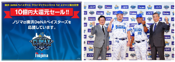 株式会社ノジマ(神奈川県横浜市、代表執行役社長 野島廣司)は、2019年10月5日(土)より横浜DeNAベイスターズクライマックスシリーズ・セ ファーストステージ進出&初ホーム開催を記念して、ノジマ史上最大の10億円還元セールを開始いたしました。※1