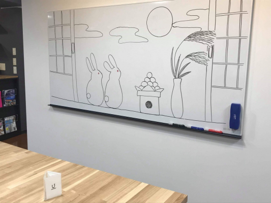 また、デザイナー笠井の得意なイラストにより、社内に「中秋の名月」が現れ、社員はその名月を鑑賞しながら、大きなテーブルを囲み特製月餅を賞味しました。