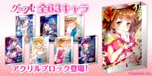大好評頂いている「グリモアA」と「カワセル」の大型コラボ、第三弾が登場!「グリモアA」5周年を記念し行われた「イラスト総選挙」、全キャラクター63名のそれぞれ1位のイラストが「カワセル」限定で超豪華アクリルブロックとなり販売開始です。最高級のアクリル素材を使用し、透明度と重量感のあるアクリルブロックは、コレクターズアイテムとして最適!この機会お見逃しなく!