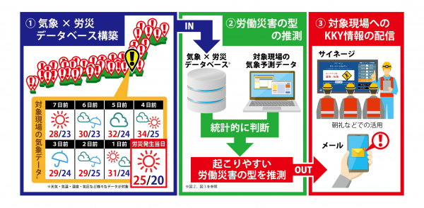 建設現場では、作業前の危険予知活動(以下、KY活動)で、現場の状況や気象情報などを念頭に、起こりうる労働災害を想定し、その対策を講じることで労働災害の未然防止に取り組んでいます。例えば気温と湿度が高い場合、熱中症対策を講じます。両社は、これまで注目されてこなかった他の労働災害と気象との関係性に着目し、労働災害データと気象データの相関を分析した結果、データ同士に関係性があることを見出し、本システムを開発しました。