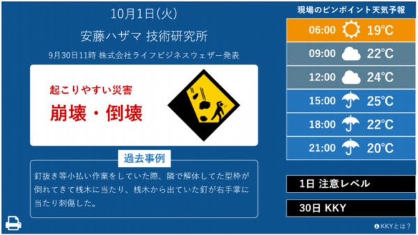 株式会社ライフビジネスウェザー(本社:東京都中央区、社長:石川勝敏、以下「ライフビジネスウェザー」)と株式会社安藤・間(本社:東京都港区、社長:福富正人、以下「安藤ハザマ」)は、気象情報から、現場で起こりやすい労働災害を推測し、注意喚起情報を配信する気象危険予知システム(KKY)を共同で開発し(特許出願中)、2019年10月8日本システムのファーストバージョンを発表致しました。