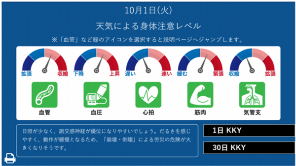 本システムでは、過去の労働災害データと気象データを組み合わせ、労働災害が発生しやすい気象条件を特定するためのデータベースを構築します。そのデータベースと日々の天気予報を対比することで、起こりやすい労働災害の型を推測し、その情報(例えば、「激突災害」「墜落・転落災害」など)を配信します(図-2)。さらに労働災害の過去事例や生気象学(注1)から考察した身体への影響に関する情報も同時に配信します(図-3)。