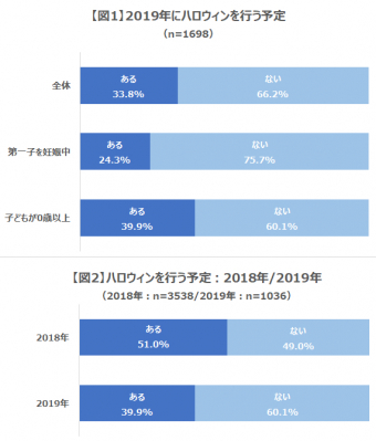 妊娠中または子どもがいるママパパ1698名に対して、2019年にハロウィンを行う予定があるかどうかを伺ったところ、全体では「ある」と回答した方は33.8%、「ない」と回答した方は66.2%となりました(図1)。