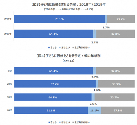 ハロウィンを行なうと回答した方に対して、子どもに仮装をさせるかどうかについても伺いました。2018年と2019年を比較してみると、仮装「させる」と回答したママパパが2018年は75.1%でしたが2019年は65.4%になり、約10%減っています(図3)。今回の結果からは、ハロウィンを行なうと回答した人であっても子どもに仮装をさせるという人は減少傾向にあることが分かりました。