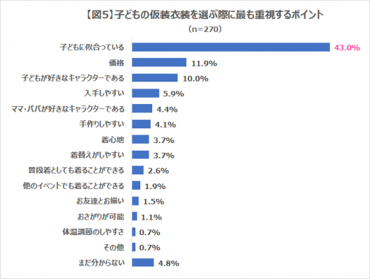 子どもの仮装の衣装を選ぶ際に最も重視するポイントとしては、「子どもに似合っている」が43.0%で1位となりました(図5)。2位は「価格」で11.9%、3位は「子どもが好きなキャラクターである」で10.0%に。