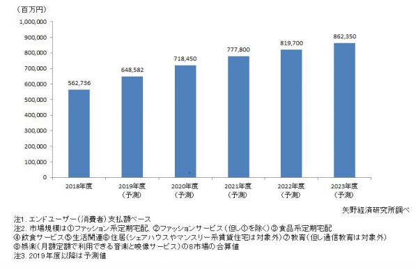 モノの所有から利用へと消費動向が変化し、アパレルもサブスクリプション型のサービス活用が増えています。2018年のサブスクリプション型サービスは国内市場規模5,627億、2023年には8,623億と拡大傾向が見込まれます。(※矢野経済研究所調べ)