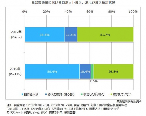 国内食品メーカーの工場を対象としたアンケート調査によると、回答企業のうち、過半数に当たる50.4%が「ロボットを既に導入済」であると回答した。2017年に実施した調査結果では、「ロボットを既に導入済」と回答した企業は36.8%であり、13.6ポイント上昇した。尚、ロボットを導入している具体的な製造・加工プロセスについては、箱詰め・包装・パレタイジングなど、食品製造の後(下流)工程において導入している事例が多いと言う結果になった。