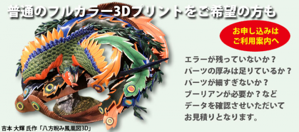 長崎県の世界遺産「軍艦島」や3Dアーティストの吉本大輝さんが立体化した葛飾北斎の名画「八方睨み鳳凰図3D」をフルカラー3Dプリントした株式会社ホタルコーポレーション(大阪市住之江区浜口西1丁目13-3 螢印刷ビル4階、TEL: 06-6676-5525、福永 進社長)は2019年10月14日にフルカラー3Dプリント受注専門サイト「hotaru3d.com(ホタルさんで.ドットコム)」をオープンしました。VRMやFBXのサーフェスデータをソリッドデータに変換してフルカラー3Dプリントできるサービス『それなり~の』も好評受付中です。