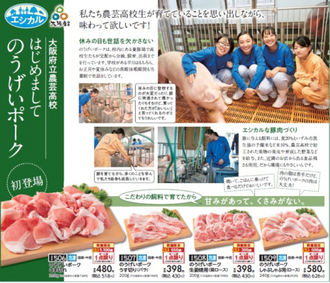 大阪府立農芸高校の高校生たちが交配から分娩、飼育、出荷までを行う「のうげいポーク」。商標登録され、「大阪産」に認定されたブランド豚です。
