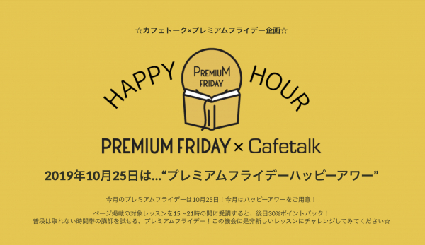 世界中の講師と生徒をつなぐオンライン習い事サイト「カフェトーク( https://cafetalk.com/ )」を運営する株式会社スモールブリッジ(本社:東京都渋谷区、代表取締役:橋爪 小太郎)は、2019年10月25日のプレミアムフライデーに向けて、通常より余裕のある夕刻を有効活用するための、おすすめのオンラインレッスンをご紹介するスペシャルページをリリース致しました。10月のプレミアムフライデーもハッピーアワー企画もご用意!ハッピーアワー中に受講した対象レッスンは30%ポイントバックになります。
