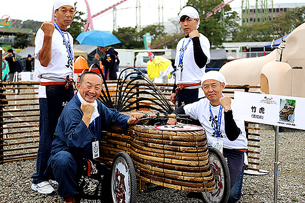 レースとあってタイムを競うのはもちろん、「おバカなレースに大まじめ」をコンセプトにしたこの大会では車体やコスチュームのデザイン、出走前のステージパフォーマンスも重要なポイントです。虎斑竹をより多くの方に知ってもらいたい竹虎は、日本唯一の虎竹でつくった車「REIWA-125号」、同じく鎧「虎竹アーマー」で参戦。そしてパフォーマンスの小道具も虎竹製と、虎竹にとことんこだわりました。