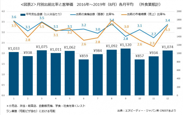出前の月次の出前比率をみてみると(図表2)、2016年~2019年(8月まで)の各月平均で、客数のピークは1月が最も高く3.6%、3月が3.5%、8月と12月が3.4%でした。また、売上のピークは、客単価の高い8月が高くなり3.6%、1月、3月が3.5%、12月が3.4%で高くなりました。