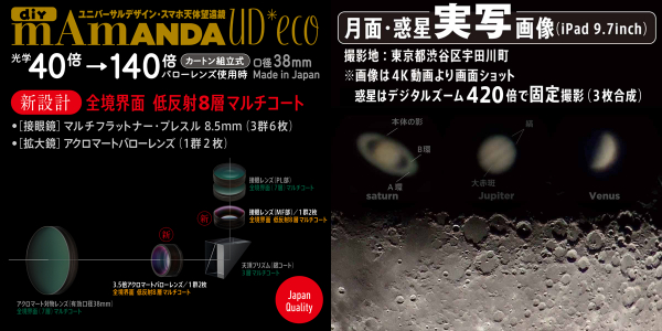 一般社団法人TOCOLは、390-680nmの波長領域の反射率を「0.1%以下」に抑えた新開発の低反射8層コーティングレンズを施した高性能DIYユニバーサルデザイン・スマホ天体望遠鏡「mAmANDA UD*eco」を安価(4,800円+税)で発売を開始した。(10月17日)