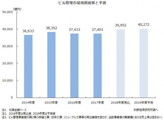 2019年度の国内ビル管理市場規模(元請金額ベース)を、前年度比100.8%の4兆272億円と予測する。2019年度は、依然として人手不足への対応は大きな課題となるものの、収益性を重視した案件獲得に注力することで、市場は微増傾向を維持する見通しである。大手のビル管理事業者を中心に、業界では安心安全な職場環境の提供、ビル管理業務の品質の確保が引き続き重要な課題となると見込みである。