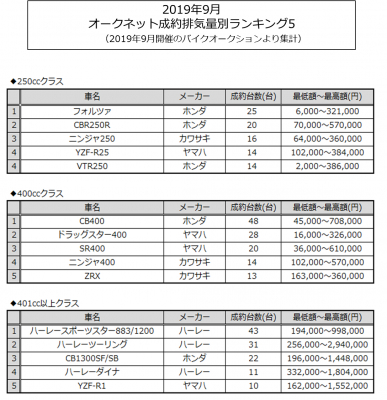 情報流通支援サービスの株式会社オークネット(本社:東京都港区/社長:藤崎清孝)は、2019年9月度のオークネットバイクオークションにおける成約台数を集計し、排気量別ランキングベスト5をまとめました。