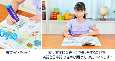 絵や文字を「音声ペン」でタッチするだけで、ネイティブの発音で単語や英語フレーズを教えてくれます。また、音声ペンに自分の声を録音することで「話す力」も鍛えられるので、特にスピーキングが重視されている小学校英語の準備にぴったりの内容です。
