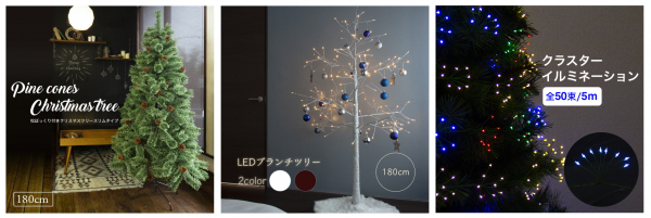 ツリーの足元をお洒落にできるフリース素材のツリースカートや、光が花のように美しく光るクラスターイルミネーションなど、全部で11種類のクリスマス商材を新たに販売しております。