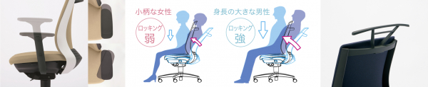 小柄な女性や身体の大きな男性でも自動的に体重を感知し、理想的なロッキングの強さを実現します。また、ロッキング固定レバーが付いており、背もたれの角度を4段階で固定可能です。