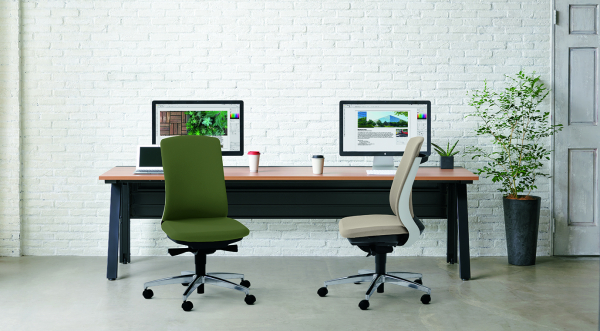 背タイプはローバック、ハイバック、エクストラハイバックの3タイプ。脚はアルミ脚と樹脂脚。肘はアジャスト肘と肘なしの2種類。本体カラーはS字フレームが白く強調されたバイカラータイプと、ダークグレー単色タイプの2色。クロスカラーは、現代の木調のオフィス空間にマッチする6色の「シックカラー」を展開。