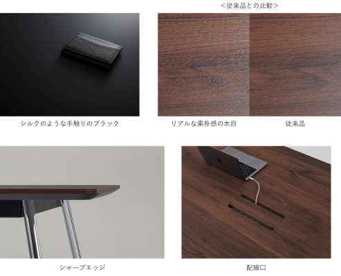 (右)リアルな素材感の木目:木目柄と同調させた凹凸の加工により、天然木のような見た目と手触りです。さらにメラミンならではの硬度と、低反射で指紋が目立ちにくい機能も備えています。