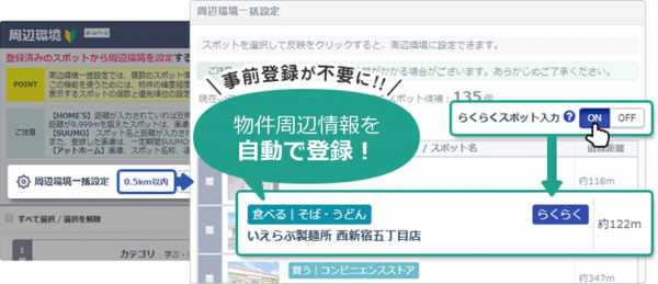 これまで物件周辺情報を設定するには、事前にスポットを手動で1件ずつ登録しておく必要がありました。