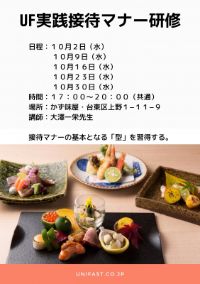 企業向けオリジナル販促グッズや記念品等のOEM生産を手がけるユニファースト株式会社(本社:東京都台東区、代表取締役社長:橋本敦)は、忘年会シーズンを前にした10月に、『実践!接待マナー研修』を開催しました。