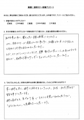 『実践!接待マナー研修』の後には社員アンケートを実施しました。当アンケートでは、「研修内容」について、参加者全員が「満足」と答え、まさに満足度100%の研修となりました。