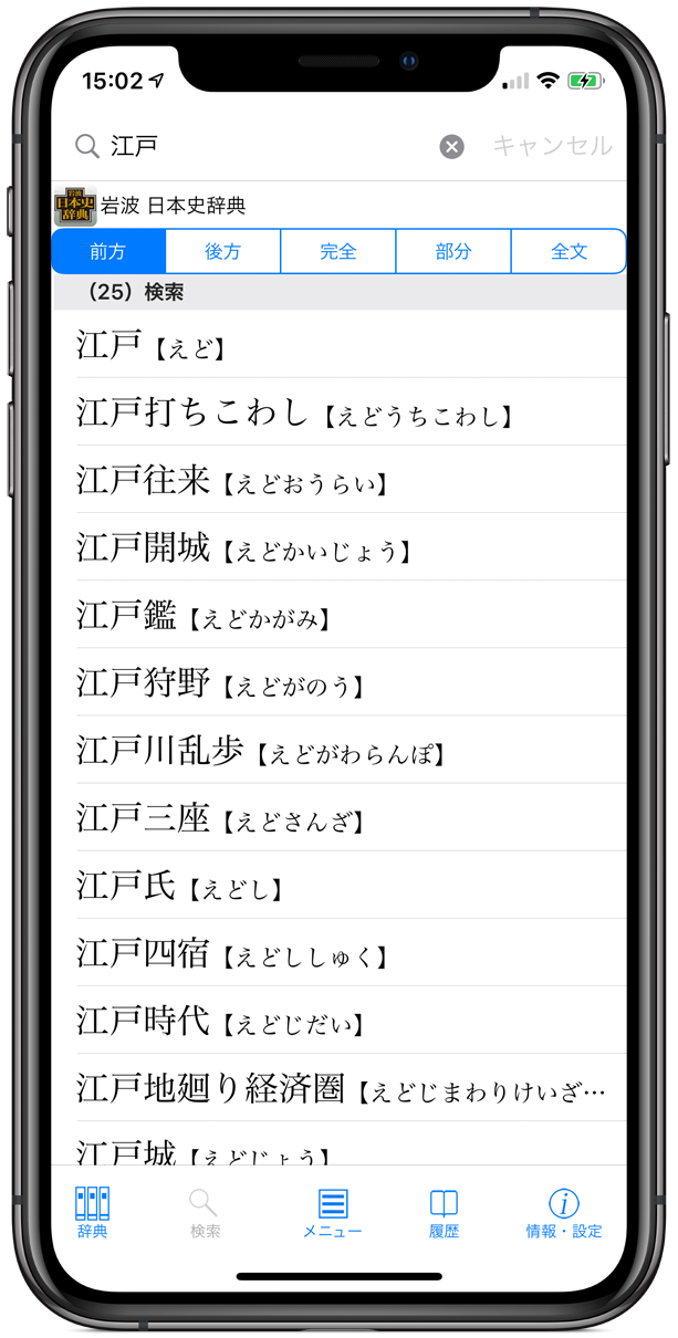 ●豊富な検索オプションを用意(前方一致/後方一致/完全一致/部分一致/全文検索)。それぞれの検索方法で、文字を入力すると候補見出し語が表示されるインクリメンタルサーチに対応。(部分一致/全文検索を除く)用語をうろ覚えでも検索が容易です。