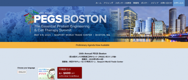 会議:「16th Annual PEGS Boston-第16回タンパク質抗体工学サミット (PEGS) ボストン大会」