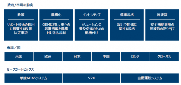 SBDでは車載アクティブセーフティシステムへの法規制の影響に関する調査・分析を継続的に行っており、最新情報をまとめた「セーフカーガイド:法規制編」を四半期ごとに発行しています。