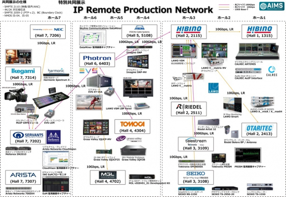 ・1~7ホールまでを横断し、13社のブースを接続する広域のネットワーク「IP Remote Production Network」を介しSN2000シリーズを用いたSMPTE ST2110ベースの映像伝送 (以下の図参照)