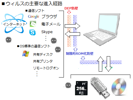 コンピュータウィルスは単体では犯罪目的で開発された単なるプログラムです。ですからディスク装置に保存する必要があります。ネット経由で一時的にメモリ上に寄生しても電源OFFで消えます。つまりプロ グラムの書き込みを禁止すれば感染できません。まさに制限的 ROM化は抗生物質の役割をします。