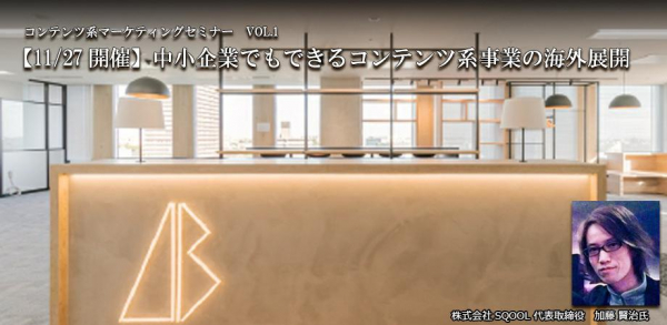 ゲーム情報ウェブメディア「SQOOL.NETゲーム研究室(https://sqool.net/)」を運営する株式会社SQOOL(本社:東京都港区 代表取締役:加藤賢治)は、代表の加藤賢治が11月27日に開催される松戸コンテンツ事業者連絡協議会主催のイベント、「コンテンツ系マーケティングセミナーVOL.1 中小企業でもできるコンテンツ系事業の海外展開」に登壇することをお知らせいたします。