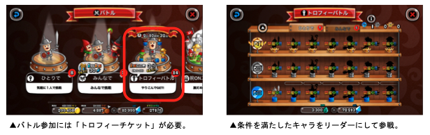 トロフィーバトルは、出場条件を満たしたキャラをリーダーにして戦い、“トロP”を獲得することが目的のバトルです。一定数のポイントがたまると、さまざまな報酬のほか、キャラの能力値が上昇する“D1武具”などが入手できます。