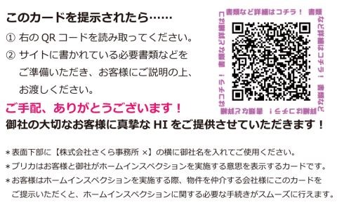 「プリカ」は、HIを利用したい買主の方が、不動産仲介会社様に提示することで、HI希望の意思表示を簡単に示すことができるカードです。提示された仲介会社様は、裏面にあるQRコードを読み込むことで、さくら事務所のWEBサイト内にある手続き方法に従って、準備していただくものがわかるなど、HIに関連する業務の簡易化を図ることができます。
