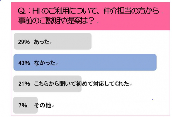 中古戸建住宅購入時にさくら事務所のHIを利用した方を対象としたアンケート調査を実施したところ、「HIについて事前の説明や提案を受けなかった」が43%という結果となりました。